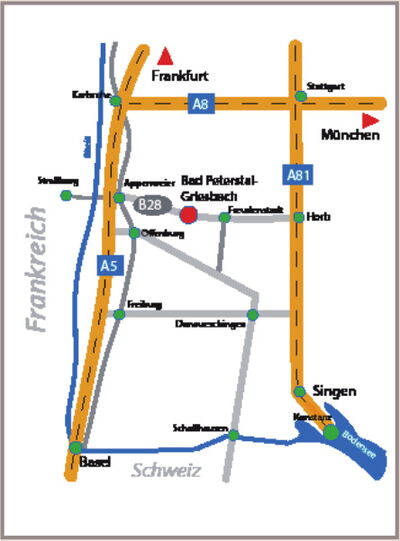 Autobahn A5 Karlsruhe-Basel, Ausfahrt Appenweier, Richtung Oberkirch, Oppenau oder über die A81, Stuttgart-Singen, Ausfahrt Horb, Richtung Freudenstadt, Kniebis.